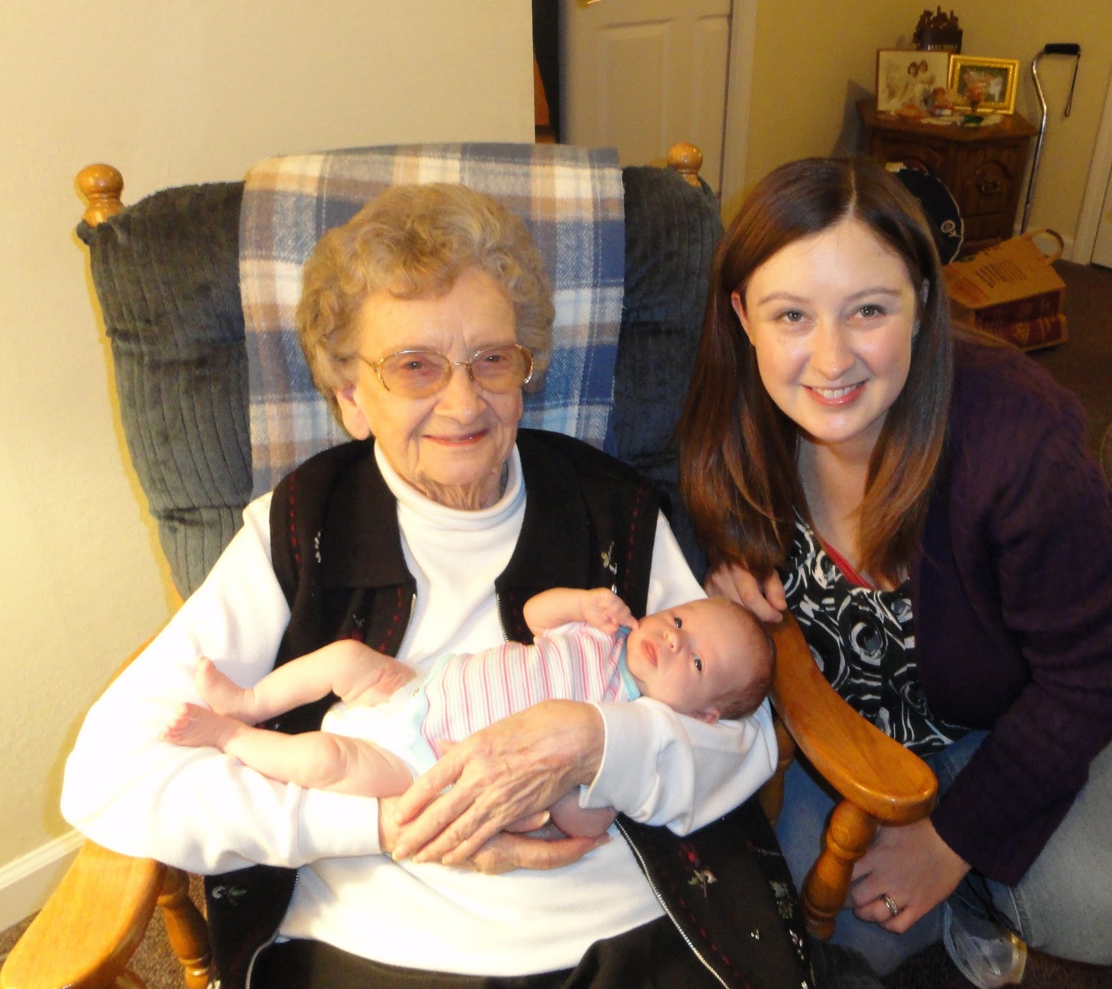 In other news, Stella took her first road trip this weekend to Mommy's home state!We My mom and dad drove to Bloomington, Indiana to visit my Mammaw, so Stella (and Mommy) went along for the ride. We surprised Mammaw -- who was beginning to think she wouldn't meet the baby until springtime, because I wasn't sure how long it would take for me to feel comfortable taking my little infant across so many miles and state lines.